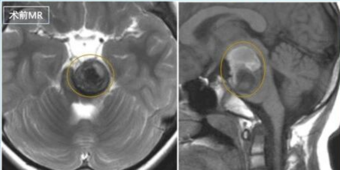 术前影像显示脑干脑桥左侧占位病变,锥体束受压,可见含铁血黄素环形成。